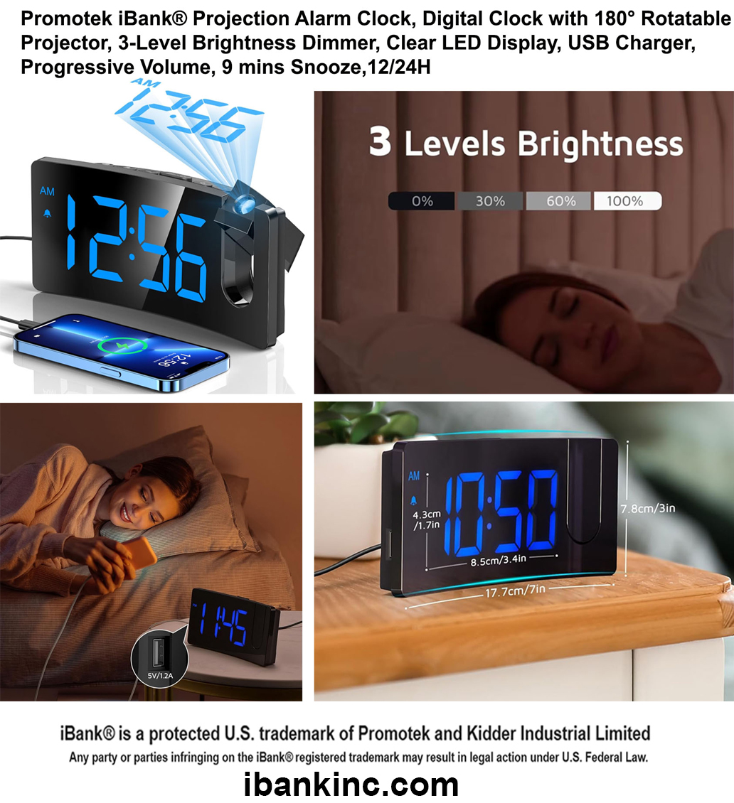 INTEGRATED PROJECTOR WITH A SHARP AND CLEAR IMAGE. The arm of this digital clock swivels 180 degrees for optimum positioning, getting the fine and smooth time figure image on the wall or ceiling at the appropriate distance. The edges of the projected numerals are surprisingly sharp and clear without having to fiddle with a focus adjustment offered on some other projection clocks. LARGE LED DISPLAY & 3 BRIGHTNESS LEVELS. The curved screen with 3.4*1.7inch large digits is easy to read in the dark, even when you are not quite awake or without your glasses. With 3 adjustable levels, you can dial down it to a level that is readable in the daytime but unobtrusive at night. It allows you to separately adjust the brightness of the face display and the projection display.
