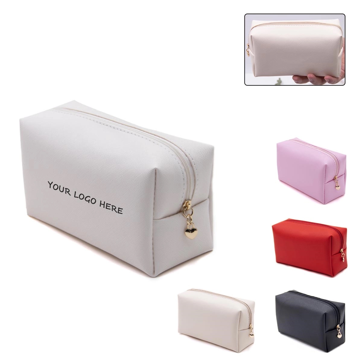 Get people to look to your business for meeting more of their needs when you offer this Blake vanity bag! It's made of leather material and features a zippered main compartment. This is perfect for taking all of your toiletries or makeup along with you on your next trip. Comes in five colors, and we recommend a spot clean/air dry for special care. Add your company name or logo and make your mark in the beauty or travel industry!